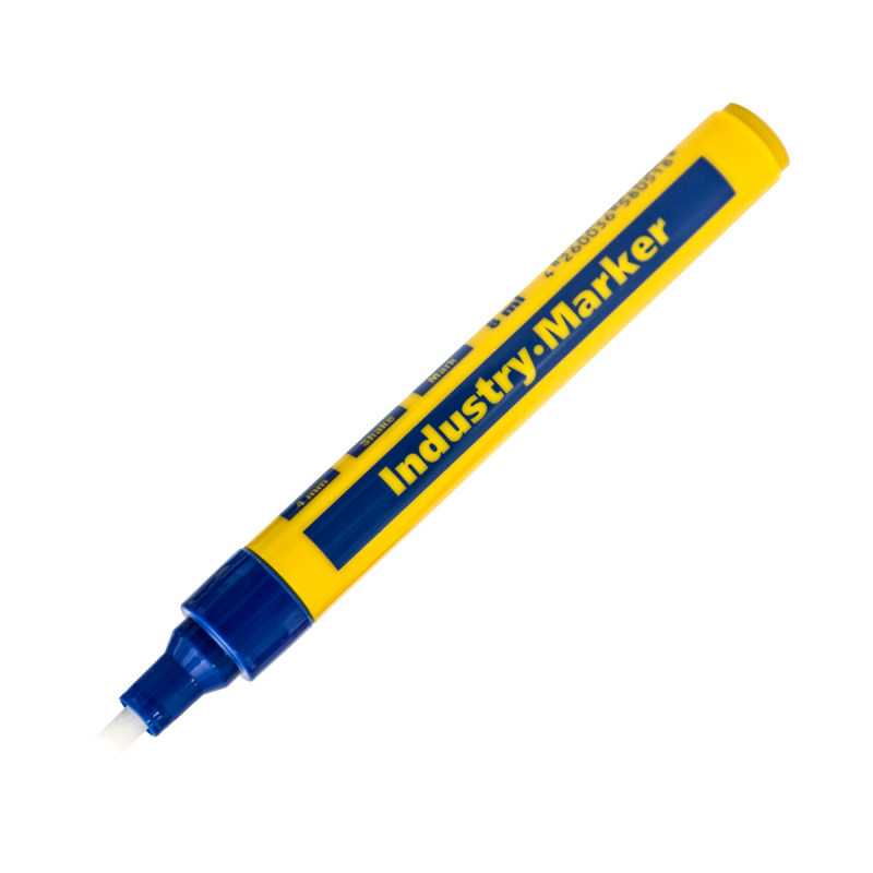 Marker industrijski 4mm, plavi je namenjen za označavanje i markiranje na gotovo svim vrstama materijala, uključujući metal, staklo, plastiku, kamen, karton, pločice i drvo. Zahvaljujući visokopokrivnom laku, posebno je efikasan za rad na tamnim površinama, obezbeđujući jasan i trajan trag. Mastilo je vodootporno i brzo se suši, što omogućava pouzdan rad i u zahtevnim uslovima. Filcani vrh može se jednostavno zameniti okretanjem – izvući, okrenuti i vratiti – što produžava vek trajanja markera i omogućava kontinuirani rad bez zastoja.